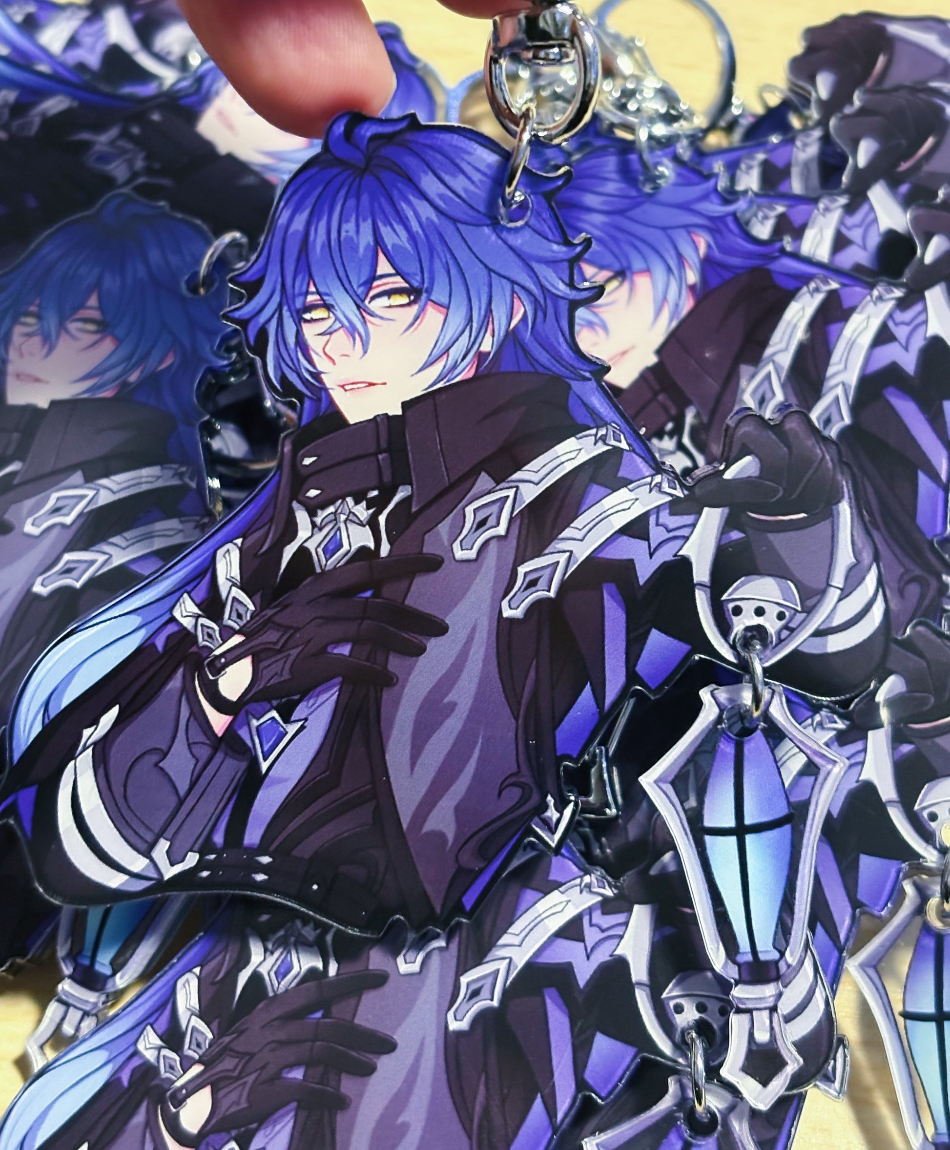 3” charm of Flins from Genshin Impact, with an additional attached lantern charm (1.5”). Moon shaped clasp.